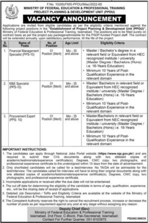 A great opportunity for those looking for Islamabad Jobs in Pakistan. A few specific roles for the new Project Planning and Development Unit (PPDU) have been advertised by the Ministry of Federal Education and Professional Training. These jobs are in Islamabad and are only for experienced people who are experts in their field.