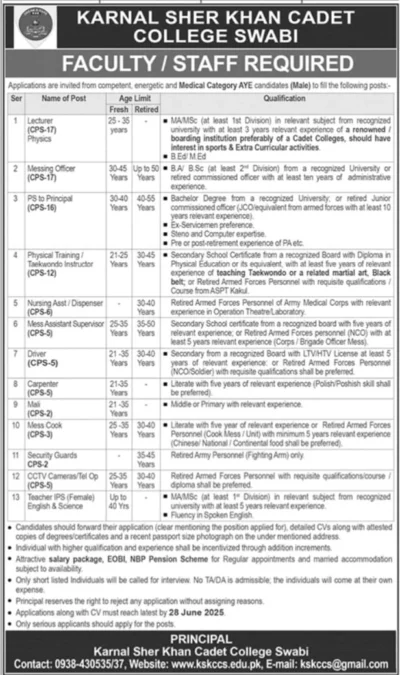 If you are looking for Cadet College Jobs 2025 in Pakistan, then you have a great opportunity. The official announcement of Karnal Sher Khan Cadet College Swabi Jobs 2025 is out where applications are being invited from fresh and retired candidates for various vacancies. This job is perfect for those who want to work in the top boarding school system of Pakistan.