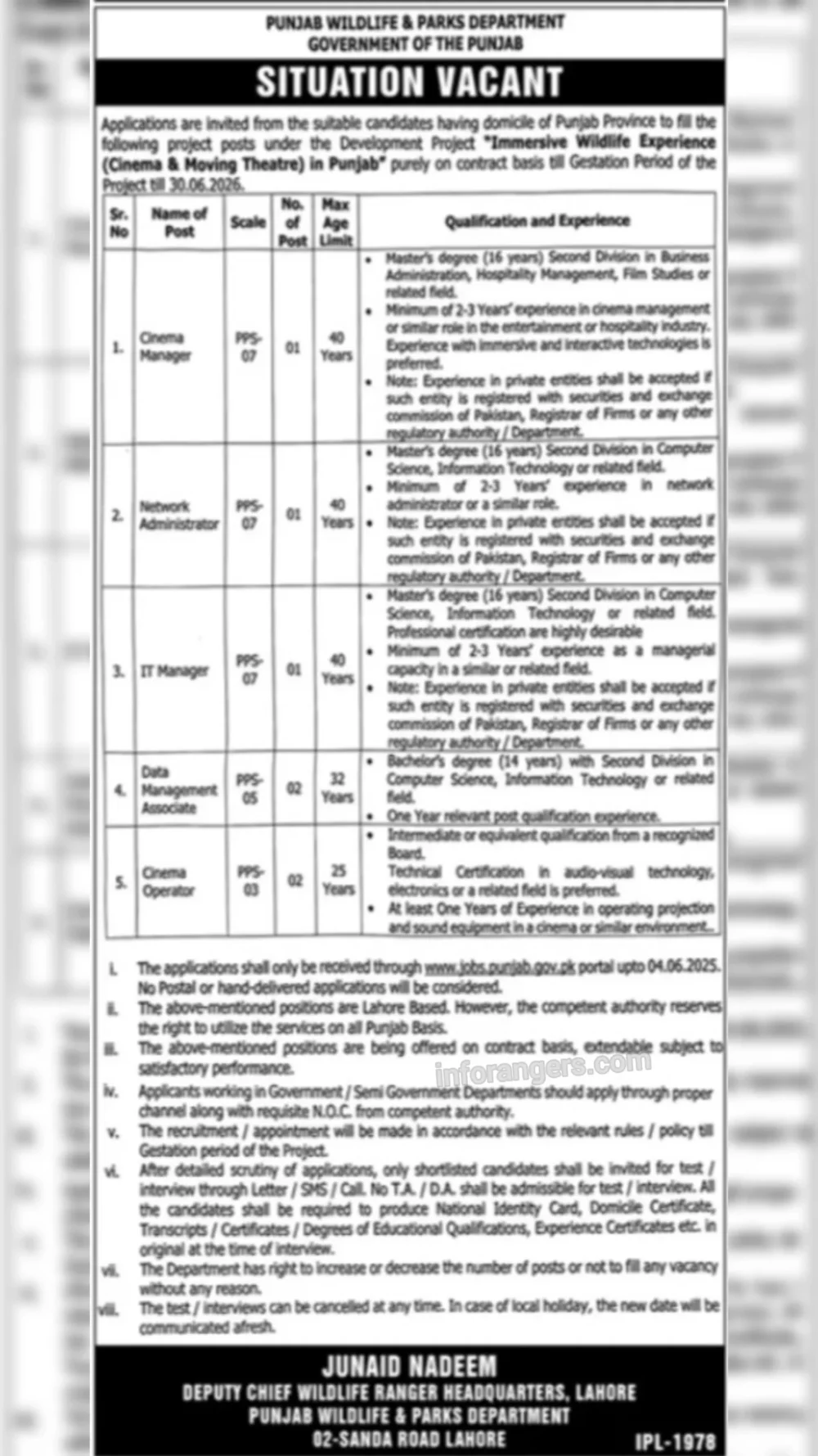 Punjab Wildlife and Parks Department Jobs 2025 has been announced, Jobs in Wildlife inviting applications for various technical and administrative posts. All these honors are for the project “Immersive Wildlife Experience (Cinema & Moving Theatre)” which will be on contract basis till June 30, 2026. If you are associated with the field of IT, Cinema Management, or Data Handling, then this can be a great career opportunity for you. The application process is easy and only online applications will be accepted.