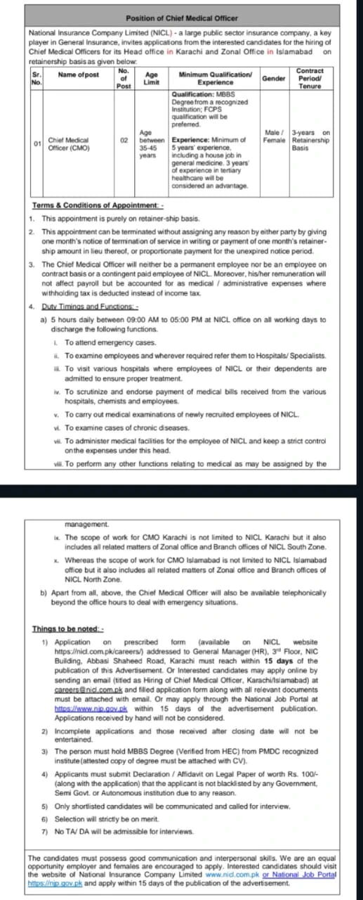If you are looking for the latest medical officer jobs in Pakistan, then you are at the right place. National Insurance Company Limited (NICL) has announced the latest vacancies for Chief Medical Officer (CMO) positions at its Karachi and Islamabad offices.