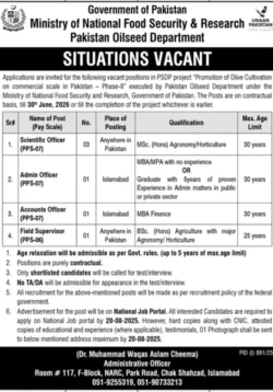 If you are looking for government jobs in Pakistan 2025, then Pakistan Oilseed Department Jobs 2025 is a must-have for you. A number of roles for the “Promotion of Olive Cultivation – Phase-II” initiative have been announced by the Ministry of National Food Security and Research.