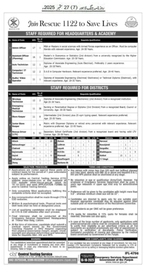 If you are looking for Rescue 1122 Jobs 2025 in Punjab, then this is a great opportunity for you. Admin Officer, Assistant Officer, IT Technician, Wireless Technician, Medical Technician, Rescue Driver and many other posts have been announced in the Punjab Emergency Services Department.